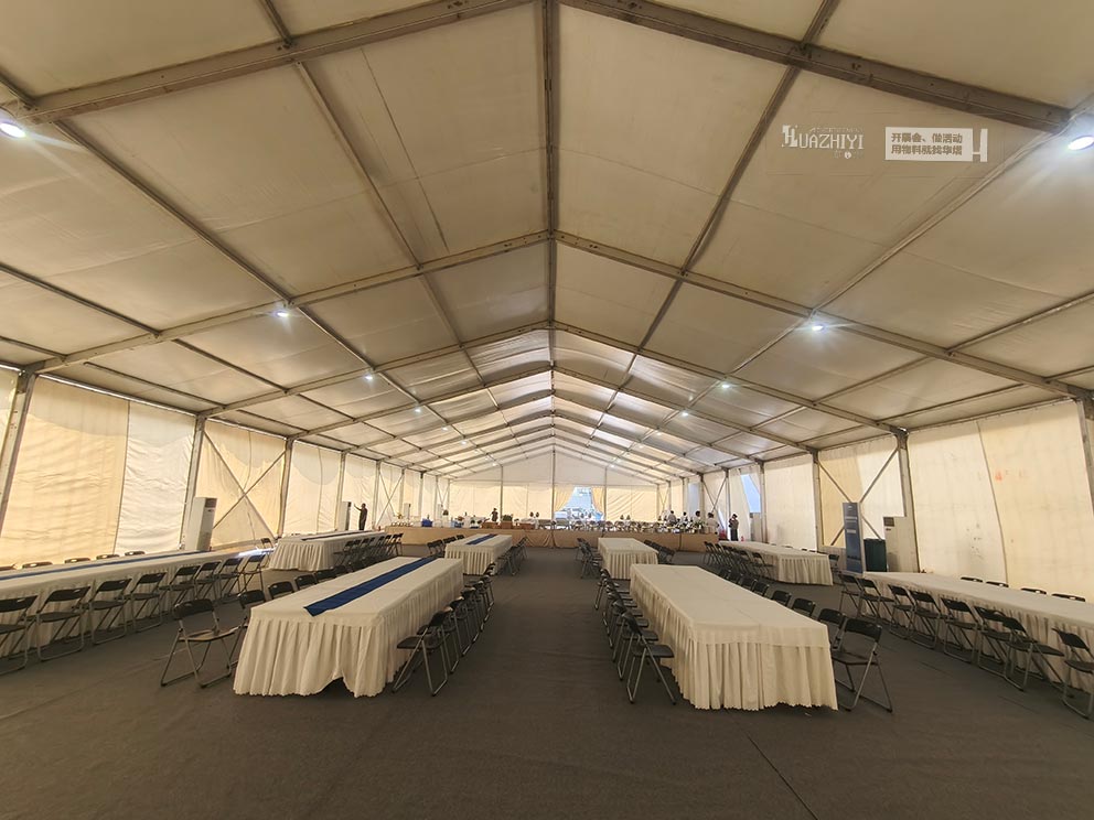 白色人字形篷房的搭建藏著應對高溫的巧思。濟源篷房租賃選用的高密度 PVC 篷布,表面覆有特殊反光涂層,正午時分站在篷下,能明顯感覺到比外界低 5-6℃的溫差。篷房人字頂的斜坡角度設計為 38 度,既利于空氣流通,又能快速排掉午后可能出現的雷陣雨。